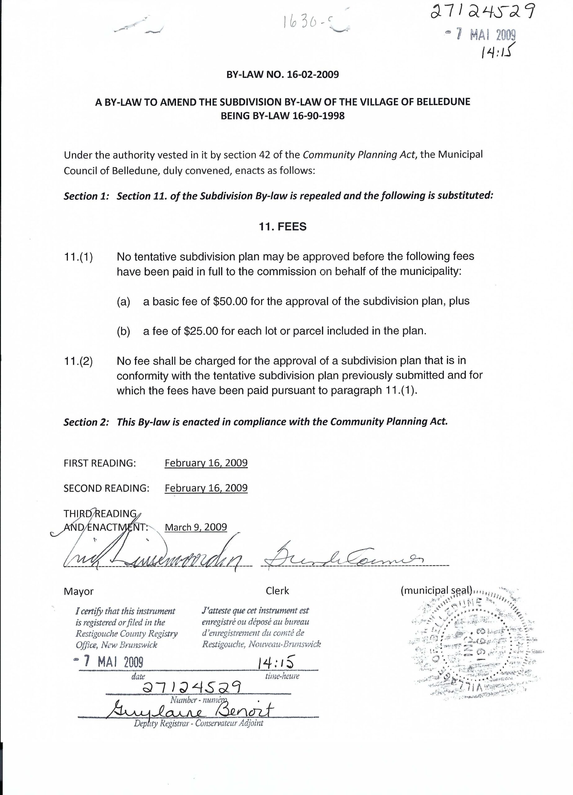 Amendment to Subdivision By-law No. 16-02-2009